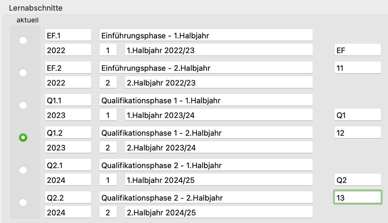 Hier sollten Sie die Kürzel und die Bezeichnungen für die sechs Schulhalbjahre der Oberstufe festlegen. Als Bezeichnung für das Schuljahr wird das Kalenderjahr eingetragen, in dem das Schuljahr beginnt.