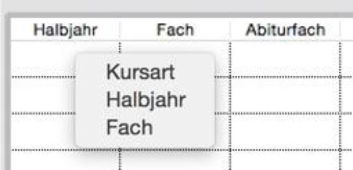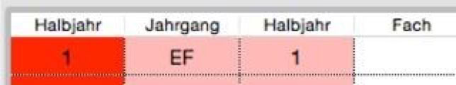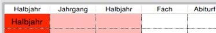 Wenn Sie beispielsweise für die Spalte „Halbjahr“ im Filter-Menü den Menüpunkt „Halbjahr“ wählen, ändert sich die Anzeige entsprechend der Definition des Filters und Sie können in die hellroten Spalten geeignete Felder aus den Datensätzen der Importdatei einfügen.