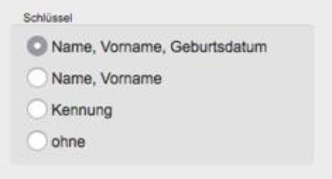 Diese drei Merkmale sind voreingestellt, weil man in der Regel davon ausgeht, dass ein Schüler anhand dieser drei Merkmale eindeutig identifiziert werden kann. Das Programm SchILD beispielsweise verwendet stets diese Merkmale zur Identifizierung. Sie können selbstverständlich andere Schlüssel auswählen.