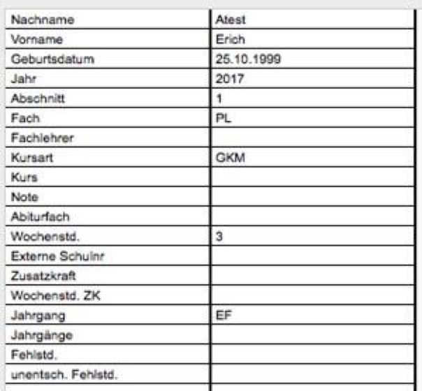 Im hier gezeigten Beispiel handelt es sich um Importdaten aus dem Programm LUPO. Für jeden Schüler und jede Schülerin sind mehrere Datensätze in der Importdatei zu finden.