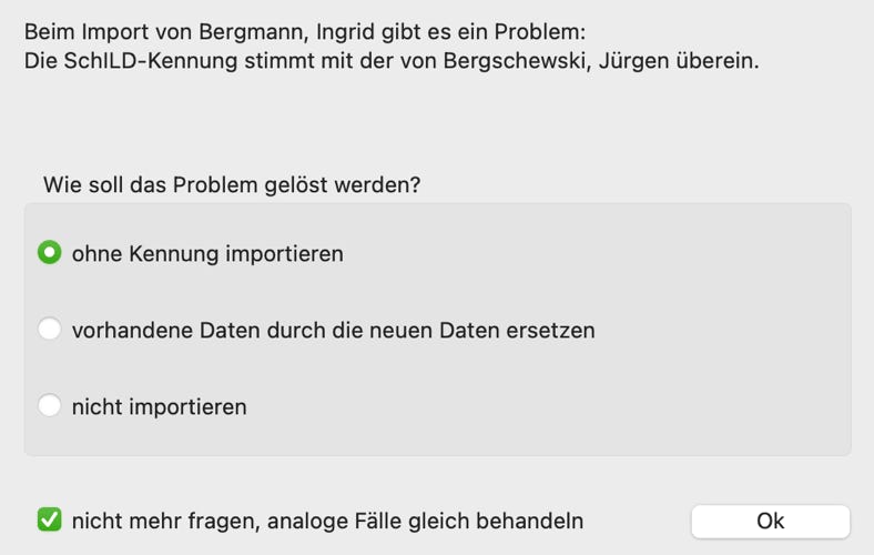 Beim Import kann es zwei Probleme geben, bei denen Sie gebeten werden, eine Entscheidung zu treffen: