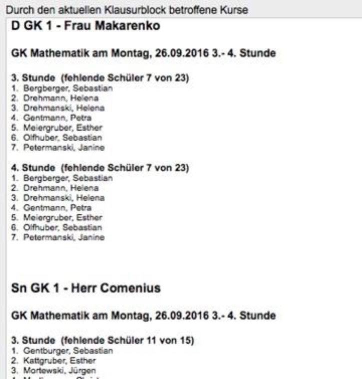 Falls Sie sich Kurse anzeigen lassen, sehen Sie für die gesamte Planung oder nur für den aktuellen Block alle von den Klausuren betroffene Kurse jeweils mit der Liste der Schülerinnen und Schüler, die aufgrund der Klausuren in einzelnen Unterrichtsstunden fehlen.