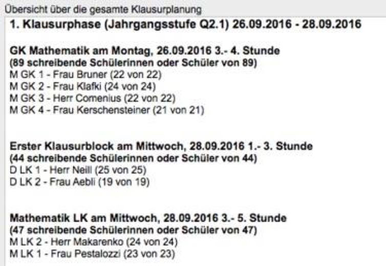 Sie erfahren, ob es Schüler gibt, die bereits drei Klausuren in der Woche schreiben. (Vier Klausuren pro Woche werden bereits während der Planung verhindert.)