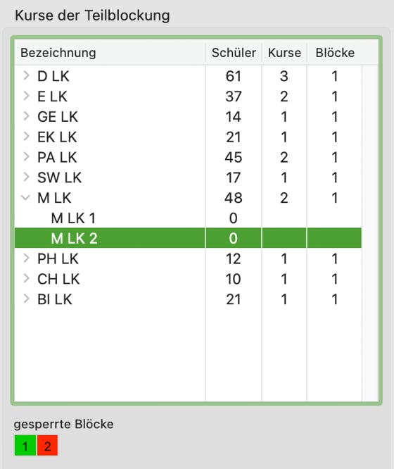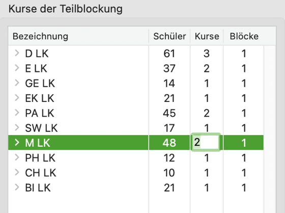 Die hier neu definierte Kursgruppe wird in die Liste der Kurse der Teilblockung übernommen. Gleichzeitig erkennen Sie, wieviele Schülerinnen oder Schüler diese Kursart gewählt haben und in wieviel Blöcken ein Kurs vorkommen soll.