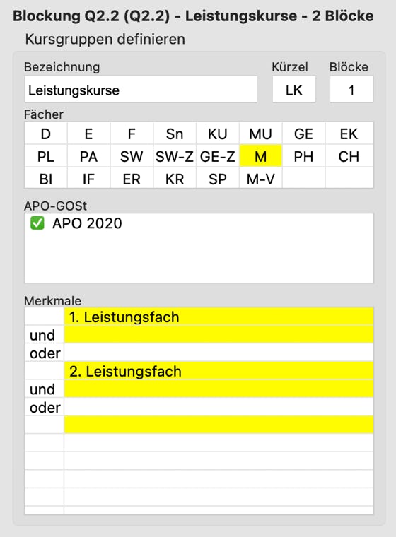 In dem Beispiel hier gehören alle Schülerinnen und Schüler der Jahrgangsstufe zu dieser Kursgruppe, die in dem Halbjahr das Fach Mathematik als 1. oder 2.Leistungsfach gewählt haben und denen die „APO 2020“ zugeordnet ist. Die Angabe der APO muss stets erfolgen und ist besonders wichtig, wenn es mehr als eine APO-GOSt für den Jahrgang gibt. In dem Fall kann unterschieden werden, ob alle Schüler zur Kursgruppe gehören sollen oder ob nach der Zugehörigkeit zur APO-GOST unterschieden werden soll.