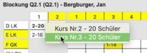 Wenn Sie einen Kurs in dem Raster anklicken, öffnet sich ein Menü, in dem Sie den Kurs auswählen, in den Sie den Schüler einsortieren wollen. In der Regel gibt es dort nur einen Kurs, es sei denn, dass es mehrere Kurse eines Faches in einem Block gibt.