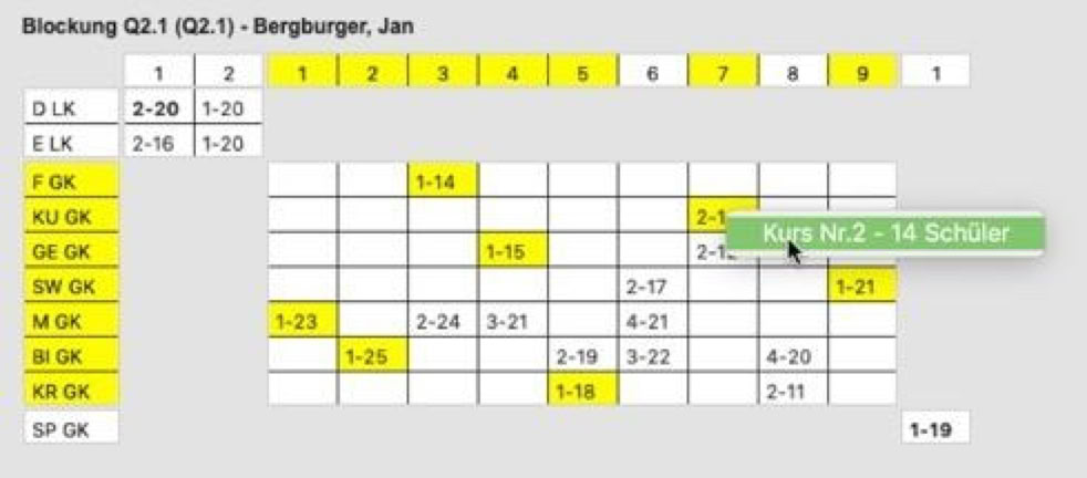 In diesem Beispiel sieht man einen Verteilungsversuch. Die gewählten Kurse sind gelb dargestellt.