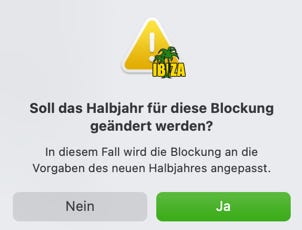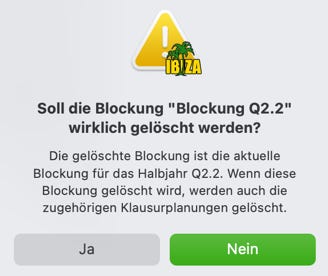 Wenn Sie dabei eine aktuelle Blockung zu löschen versuchen, werden Sie darauf hingewiesen. Insbesondere hat dies Konsequenzen, wenn Sie bereits eine Klausurplanung durchgeführt haben.
