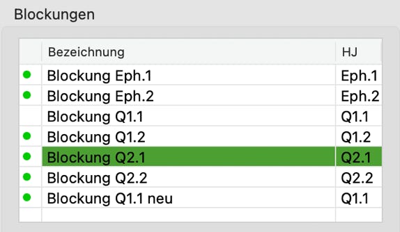 Der grüne Punkt vor dem Namen zeigt an, dass Sie diese Blockung als aktuelle Blockung für das angegebene Halbjahr ausgewählt haben.
