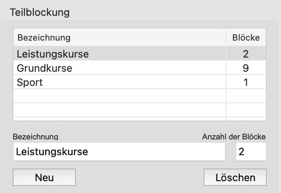 Jede Teilblockung wird an dieser Stelle durch einen Namen und die Anzahl der Blöcke für die Kurse in dieser Teilblockung beschrieben.