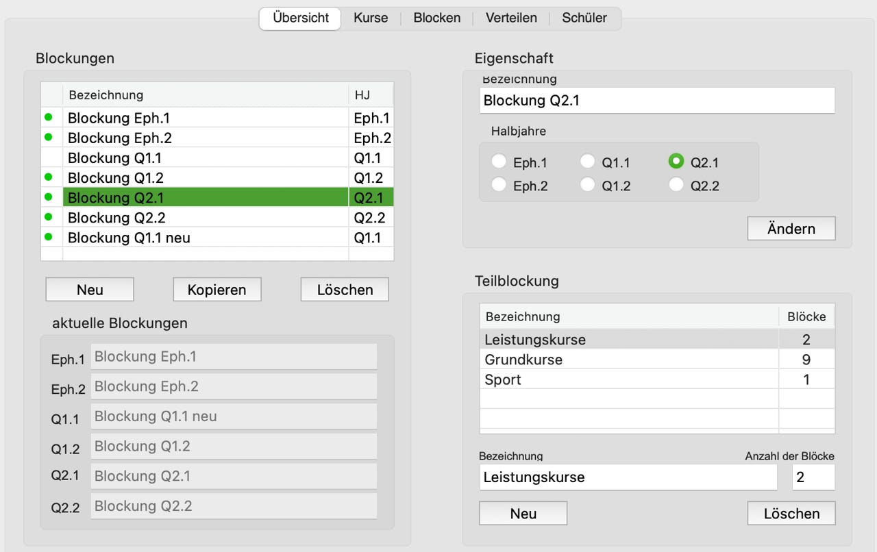 Alle eingerichteten Kurse können auf verschiedene Teilblockungen verteilt und so getrennt voneinander geblockt werden.