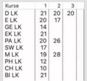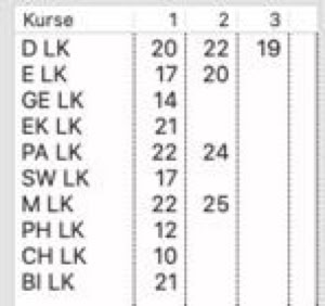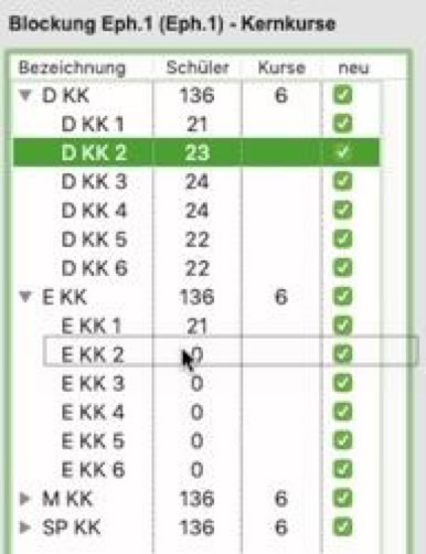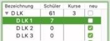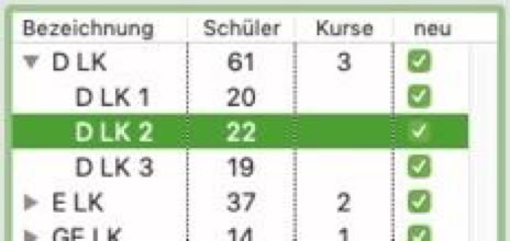 Wenn Sie in der Übersicht eine Kursgruppe (hier L GK) aufklappen, sehen Sie dort, wie viele Schülerinnen und Schüler auf die zugehörigen Kurse (L GK1 und LGK2) verteilt sind.