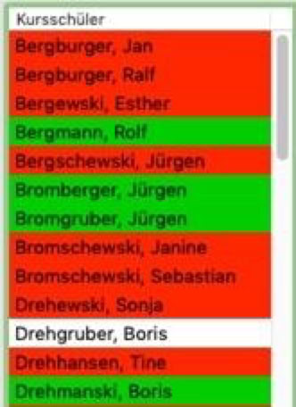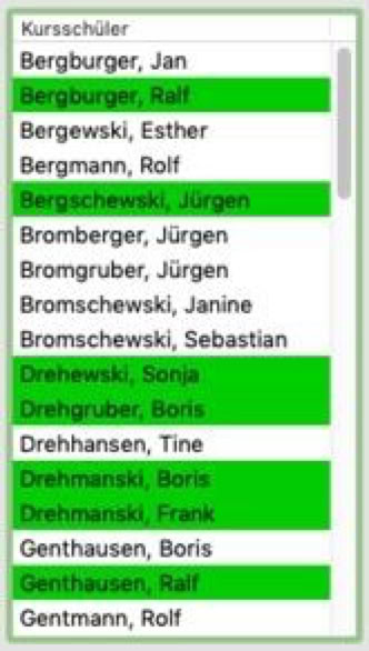 Durch Anklicken eines grün unterlegten Schülers können Sie ihn aus dem Kurs entfernen. Er erscheint dann weiß unterlegt.
