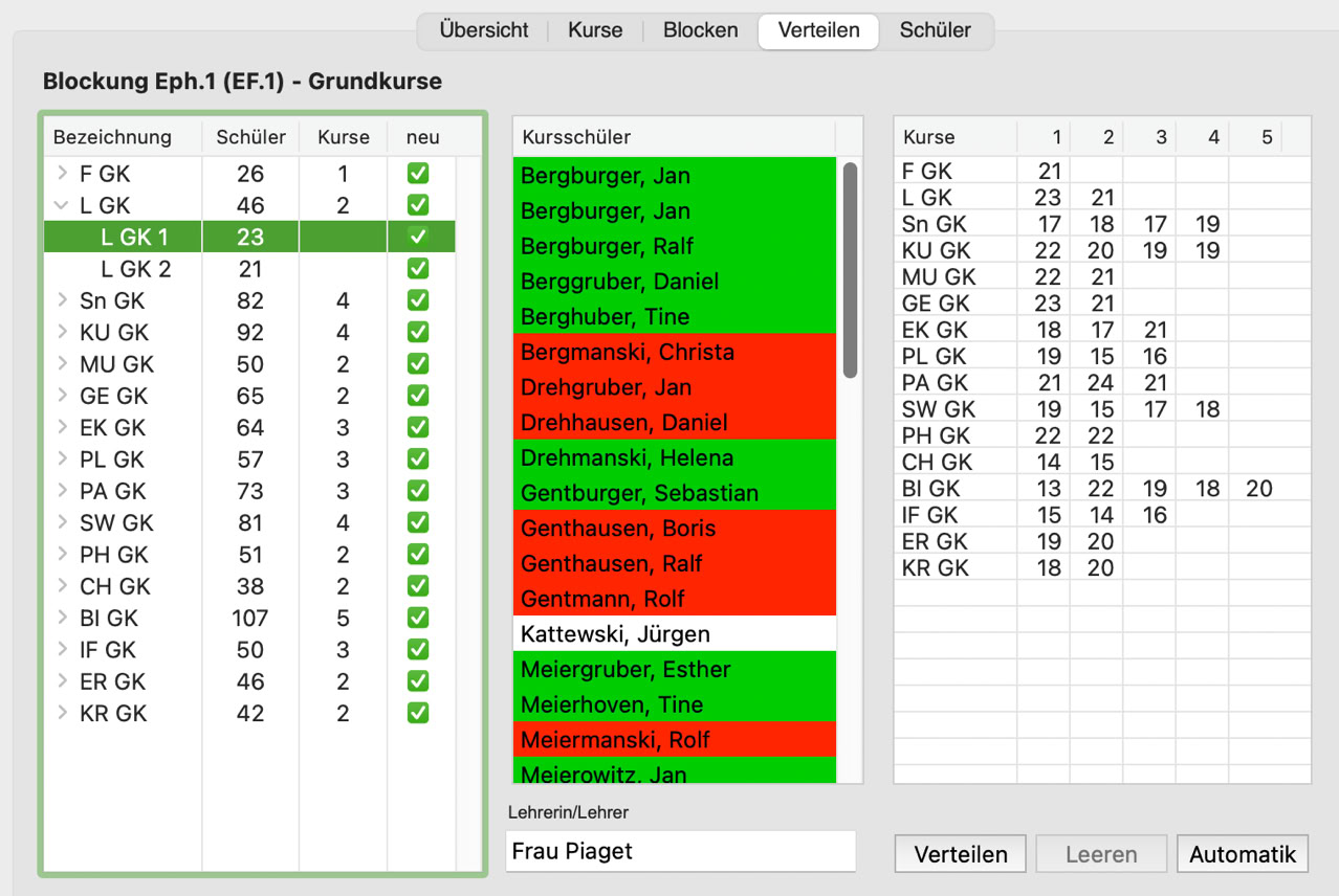 In der Regel (vor allem nach Erstellung einer Blockung) werden Sie die Schülerinnen und Schüler automatisch auf die Kurse verteilen lassen. Ein Ergebnis könnte dann wie im Bild aussehen.