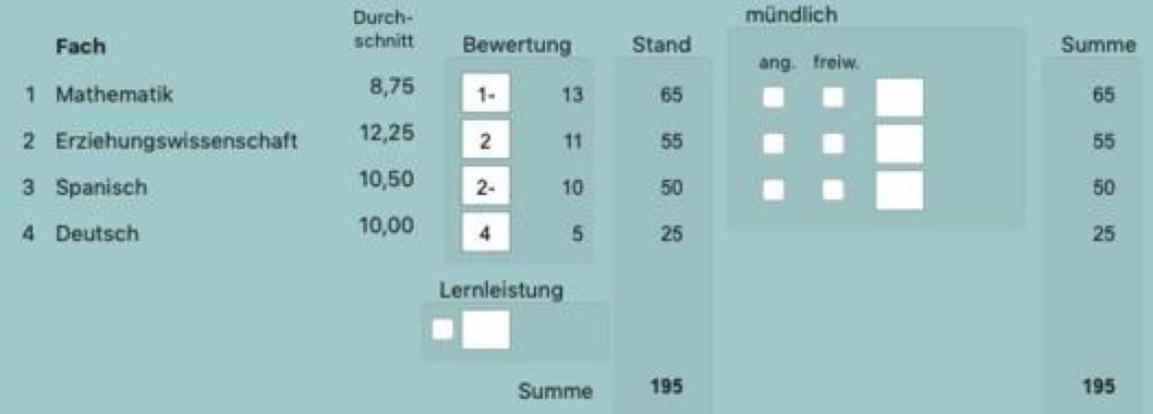 Der Zusammenfassung können Sie entnehmen, ob auf der Basis der aktuellen Prognosedaten die Abiturprüfung bestanden sein wird und welche Endnote dabei erreicht werden kann.