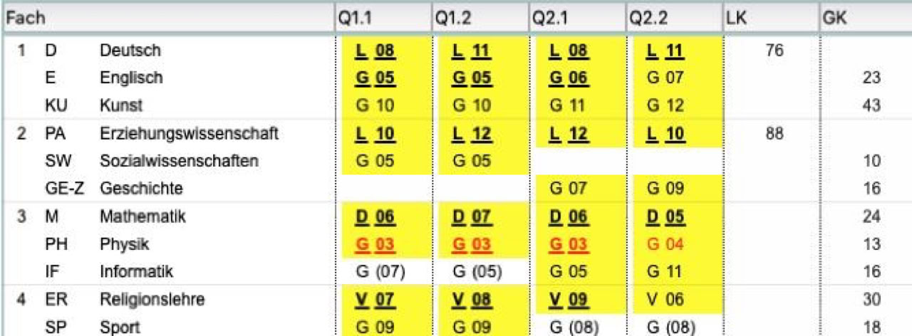 Die Eigenschaften der Kurse werden wie im Schülerfenster nach den Vorgaben in den Einstellungen hervorgehoben bzw. markiert. In den beiden letzten Spalten werden die Punkte angezeigt, die von den Wertungskursen in dem jeweiligen Fach erreicht wurden.