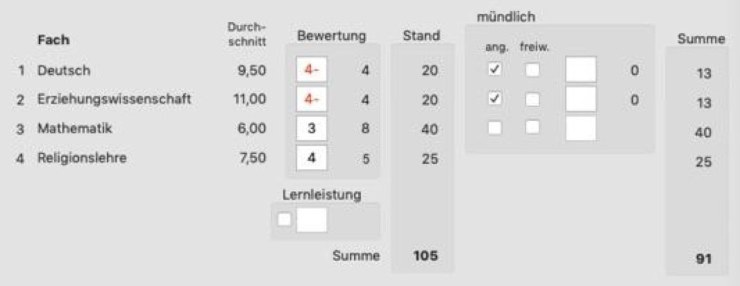 Die in der letzten Spalte angezeigte Punktsumme für das jeweilige Fach zeigt die erreichten Punkte an. Wenn also eine mündliche Prüfung vorgesehen, aber noch nicht abgeschlossen ist, sind hier in der mündlichen Prüfung keine Punkte (0 Punkte) erreicht und die Summe wird entsprechend berechnet.