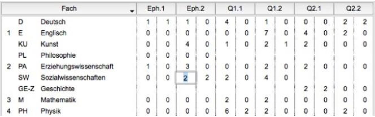 Mit der Tabulatortaste springen Sie in der Tabelle im jeweiligen Jahrgang von den Fehlstunden zu den unentschuldigten Fehlstunden bzw. zum nächsten Kurs. Die eingegebenen Daten werden automatisch für jedes Halbjahr addiert.