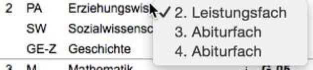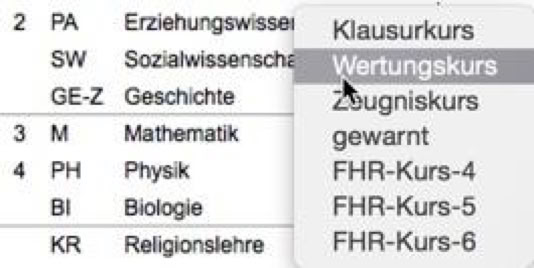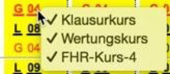 Wenn Sie beim Klick auf ein Fach auch die Optionstaste (ALT-Taste) drücken, werden im Menü alle möglichen Kurseigenschaften angezeigt. Eine Auswahl dieser Eigenschaften im Menü führt dazu, dass allen Kursen dieses Faches diese Kurseigenschaft zugeordnet wird, soweit dies möglich ist.