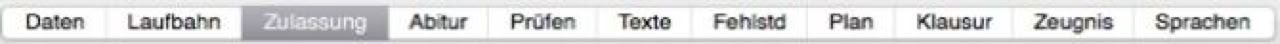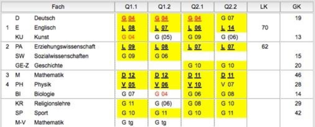 Auf dieser Registerkarte werden die von der Schülerin oder dem Schüler gewählten Kurse der Qualifikationsphase angezeigt. Die Eigenschaften der Kurse werden nach den Vorgaben in den Einstellungen hervorgehoben bzw. markiert. In den beiden letzten Spalten werden die Punkte angezeigt, die von den Wertungskursen in dem jeweiligen Fach erreicht wurden.