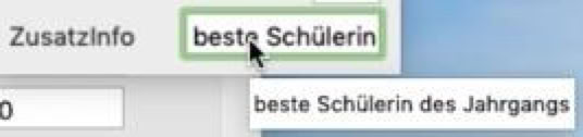 Ein besonderes Problem besteht für die Eintragung „Zusatzinfo“, die einen Text enthalten kann, der in dem zugehörigen Textfeld nicht vollständig angezeigt werden kann. Deshalb gibt es die Möglichkeit sich den ganzen Text zeigen zu lassen. Ein Klick auf das Textfeld öffnet eine kleine Azeige mit dem vollständigen Text.
