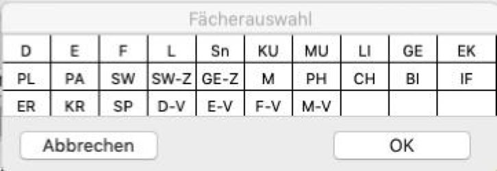Beim Klick auf den Fachknopf öffnet sich ein Fenster, in dem Sie die Fächer auswählen können, die der Schülerwahl hinzugefügt werden sollen.