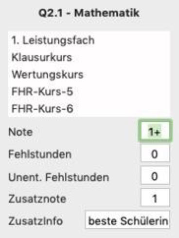 Wie auf der Registerkarte „Laufbahn“ können Sie mit einem Ctrl-Klick auf einen Kurseintrag ein Sichtfenster öffnen, in dem ihnen alle Eintragungen für den gewählten Kurs angezeigt werden. Sie sehen die Eigenschaften des Kurses und die vorgenommenen Einträge. Unter anderem sehen Sie hier auch die Zusatznote und die Zusatzinformation, die ihnen freie Einträge zum Kurs des Schülers ermöglichen. Sie können die Daten in diesem Sichtfenster auch ändern. Wenn Sie das Sichtfenster durch einen Klick außerhalb des Fensters verlassen, werden die geänderten Daten im Schülerfenster gespeichert und das Sichtfenster wird geschlossen.