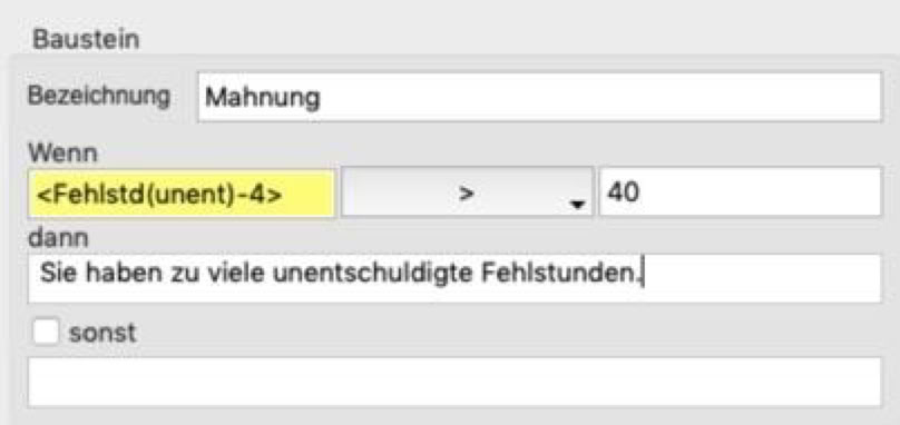 Wie im Formularfenster wählen Sie aus der Inhaltstabelle einen der dort angebotenen Bausteine. Wenn Sie einen Baustein anklicken, wird er automatisch in das gelbe Textfeld übernommen und verschiedene Bedingungen werden zur Auswahl gestellt.