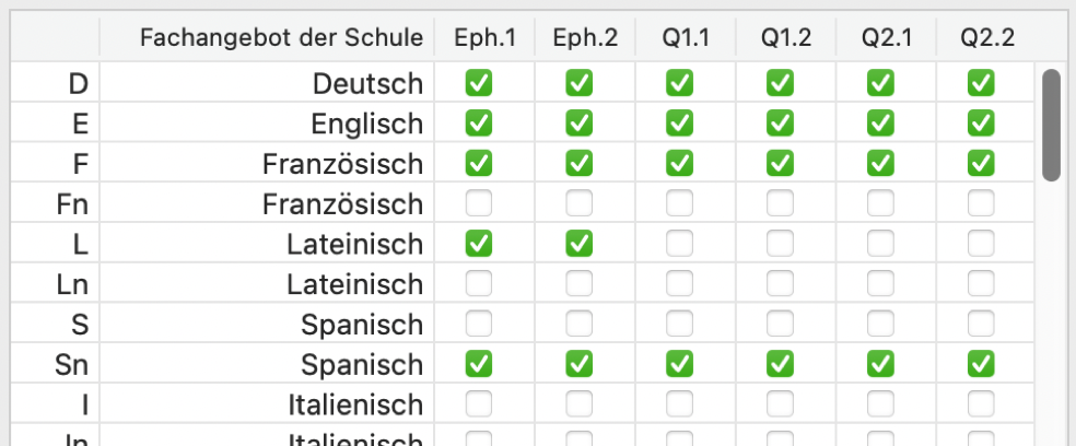 Sie können das Fachangebot durch Aktivierung einzelner Checkboxen auf einzelne Halbjahre beschränken. Durch einen Klick auf das Fach aktivieren bzw. deaktivieren Sie alle Halbjahre gleichzeitig.