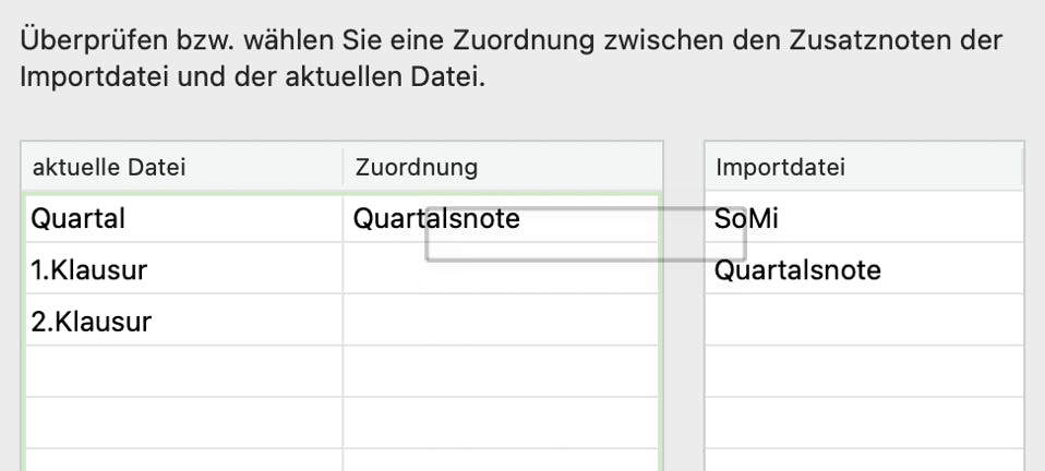 Wenn Sie dann beim Import die Option „Zusatznoten übernehmen“ wählen, werden die vorhandenen Einträge der Importschüler gemäß dieser Zuordnung in die aktuelle Datei übernommen.