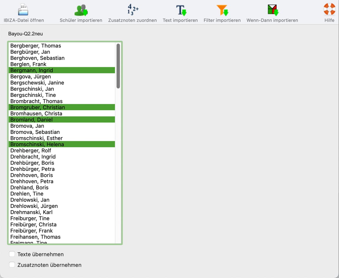 Wenn Sie in der Liste Schüler auswählen, wird das Werkzeug „Schüler importieren“ aktiv und Sie können die Daten in die Hauptdatei übernehmen.