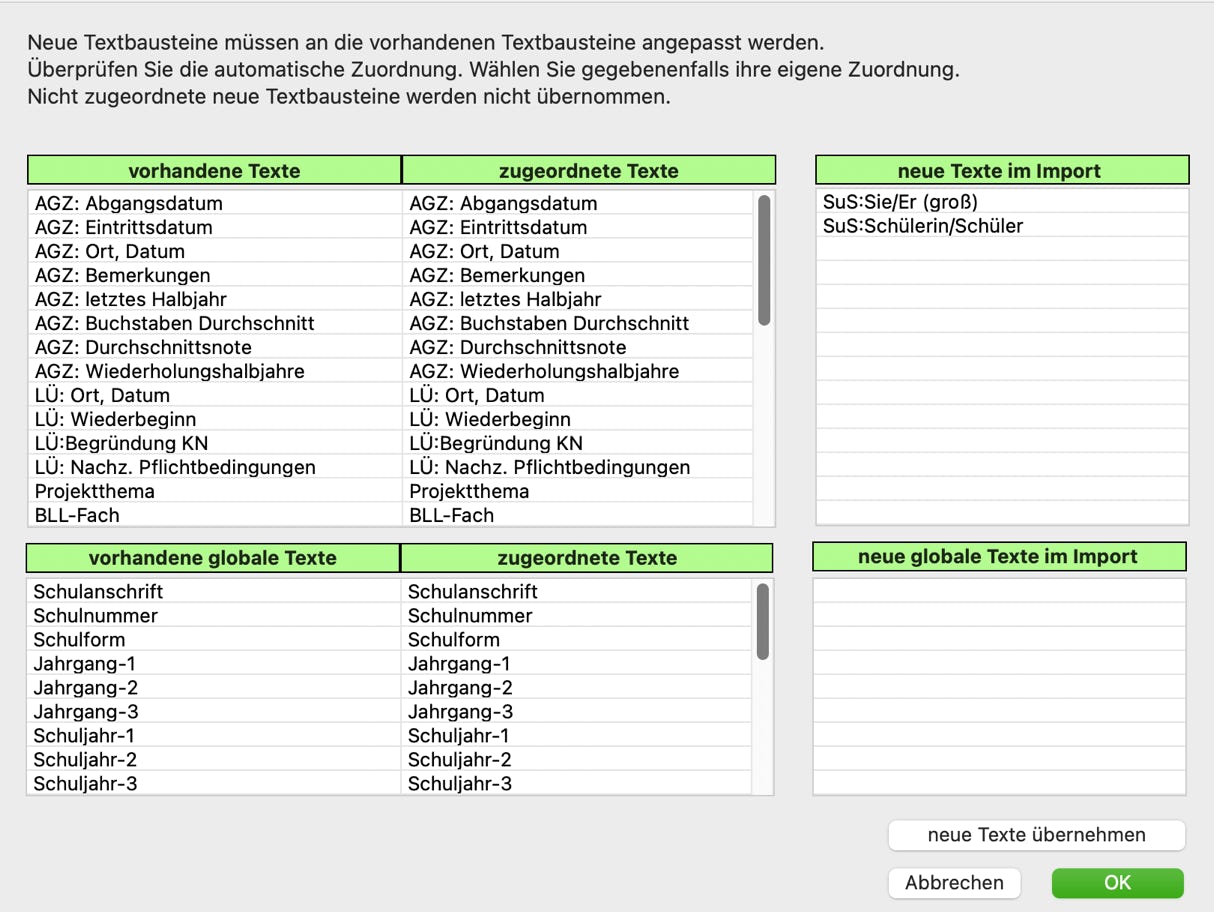 Neue Textbausteine aus der Importdatei werden zunächst automatisch den vorhandenen Textbausteinen zugeordnet, wenn Sie gleich benannt sind.