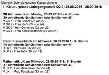Hier erfahren Sie zusätzlich etwas über die Kurse, die zur Klausurzeit stattfinden und wie viele Schüler in den Kursen verbleiben, während andere an der Klausur teilnehmen.