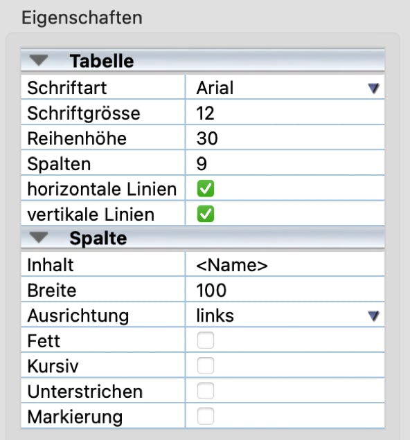 In dem Beispiel ist die zweite Spalte mit dem Eintrag „Name“ aktiviert (erkennbar am grünen Streifen über der Spalte in der Mustertabelle) und man sieht die Eigenschaften der Tabelle und die speziellen Eigenschaften der aktuellen Spalte.