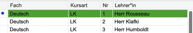 Durch Klick auf die Kopfzeile der Liste lassen sich die Einträge nach den entsprechenden Kriterien (Fach, Kursart, Nr, Lehrer*in) sortieren.