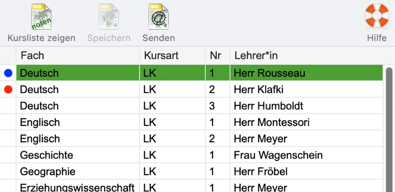 Sobald Daten in der Kursliste geändert wurden und Sie die Dateneingabe (vorläufig) beenden wollen, betätigen Sie den Sichern-Knopf und das Kursfenster wird geschlossen. Durch einen roten Punkt im Kursauswahlfenster wird angezeigt, dass Sie für diesen Kurs Eintragungen vorgenommen haben.