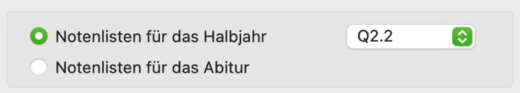 Falls Sie Halbjahresnoten erfassen, geben Sie mit dem PopUp-Menü an, für welches Halbjahr die Daten erfasst werden sollen.