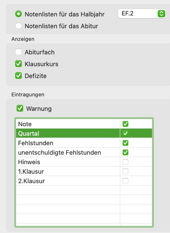Wenn Sie Notenlisten für das Abitur erstellen, können in die Listen nur Noten eingetragen werden und Sie erhalten hier keine Auswahlmöglichkeit.