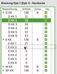 In dem Fall sollten Sie bei dem bereits besetzten Kurs die Checkbox ausschalten, um zu verhindern, dass der Kurs neu verteilt, die Schüler also bei einer neuen Blockung aus dem Kurs entfernt werden.