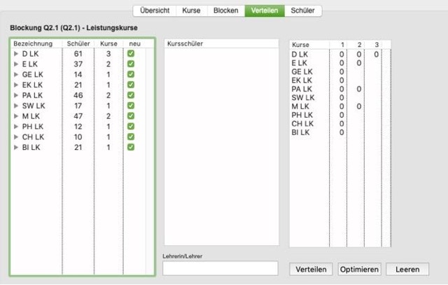 In obigen Bild kann man erkennen, dass noch keine Schüler in die Kurse verteilt sind.