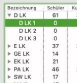 Wenn Sie z.B. einen Kurs in der Liste auswählen, sehen Sie aber in der Kursschüler-Liste die Namen aller Schülerinnen und Schüler, die zu dieser Kursgruppe gehören.