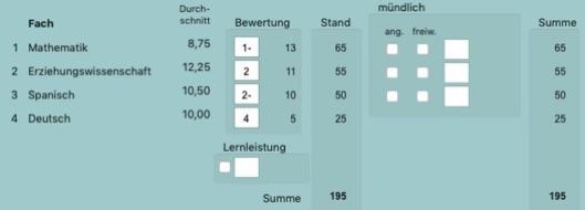 Auf der Registerkarte „Abitur“ werden alle Daten zu den zuvor auf der Laufbahn- bzw. Zulassungskarte gewählten Abiturfächern zusammengefasst. Die eingetragenen Noten beruhen allerdings auf der Hochrechnung im Prognosefenster.