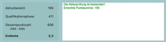 Der Zusammenfassung können Sie entnehmen, ob auf der Basis der aktuellen Prognosedaten die Abiturprüfung bestanden sein wird und welche Endnote dabei erreicht werden kann.