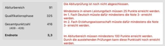 Im unteren Bereich wird der aktuelle Stand der Abiturprüfung im Klartext beschrieben. Falls die Abiturprüfung noch nicht abgeschlossen ist oder nicht bestanden wurde, ist der Text rot dargestellt. Die erreichten Punktzahlen nach Qualifikationsphase und Abiturbereich und die bislang erreichte Endnote finden Sie dort ebenfalls.