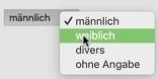 Durch Klick auf den Knopf für das Geschlecht tragen Sie das Geschlecht der Schülerin bzw. des Schülers ein. Aktuell sind bereits vier Merkmale möglich, da aufgrund der Änderung des Personenstandsgesetzes das Merkmal Geschlecht in Zukunft vier Ausprägungen („männlich“, „weiblich“, „divers“ und „ohne Angabe (im Geburtsregister)“) haben soll.