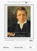Nach dem Doppelklick auf das Fotofeld öffnet sich ein kleines Bildbearbeitungsfenster. Dort können Sie zunächst eine Bilddatei auswählen. Durch Verschieben des Bildes mit der Maus bzw. Größenänderung mit dem Schieberegler oder durch manuelle Eingabe eines Zoomfaktors können Sie das Bild nach ihren Wünschen in das vorgegebene Fotofeld einpassen.