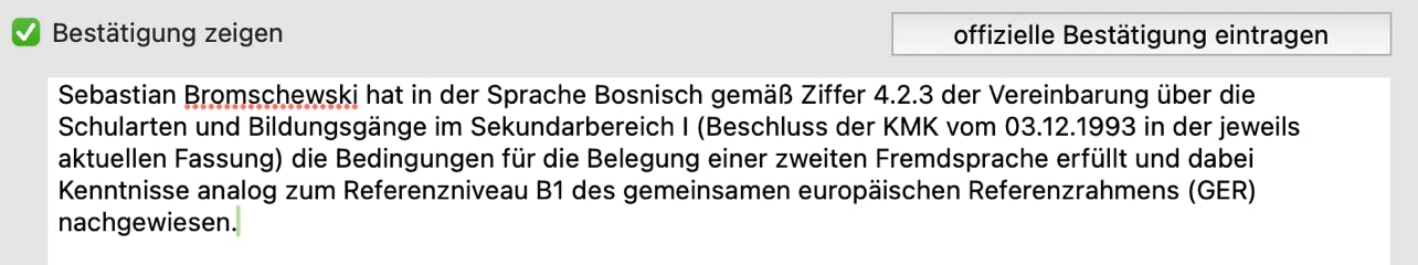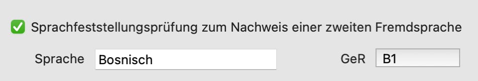 Wenn eine Schülerin oder ein Schüler eine Feststellungsprüfung zum Nachweis der Belegung einer zweiten Fremdsprache absolviert hat, können Sie das hier eintragen.