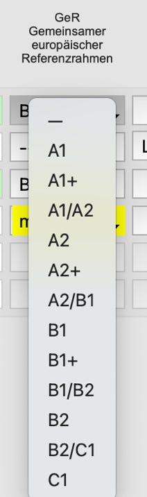 Wenn eine Entscheidung über den GeR automatisch nicht eindeutig möglich ist, wird das entsprechende Feld gelb unterlegt und Sie können manuell eine Auswahl treffen. Bei einem Klick auf dieses Feld werden ihnen in einem Menü die möglichen Eintragungen angeboten. Die gelbe Farbe bleibt erhalten, damit Sie weiterhin erkennen, dass die angezeigte Zuordnung manuell erfolgt ist.