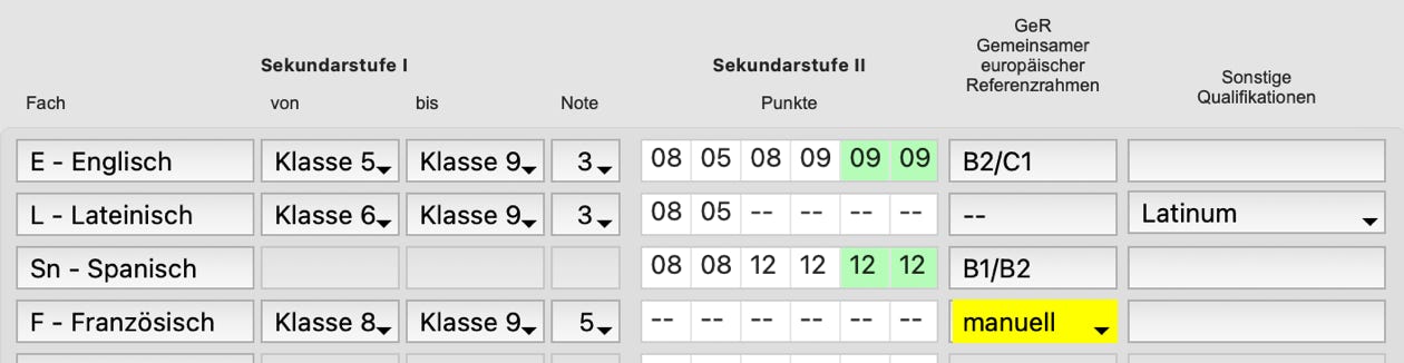 Die Übersicht über die erreichten Punkte in der Sekundarstufe II wird automatisch aktualisiert. Die Eintragung im letzten Halbjahr wird entsprechend der Regelung zur Bestimmung des Gemeinsamen europäischen Referenzrahmens (GeR) aus den Ergebnissen der Q2.2 und ggf. der Abiturprüfungen ermittelt.