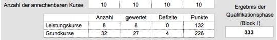 Auf dieser Registerkarte werden die von der Schülerin oder dem Schüler gewählten Kurse der Qualifikationsphase angezeigt. Die Eigenschaften der Kurse werden nach den Vorgaben in den Einstellungen hervorgehoben bzw. markiert. In den beiden letzten Spalten werden die Punkte angezeigt, die von den Wertungskursen in dem jeweiligen Fach erreicht wurden.